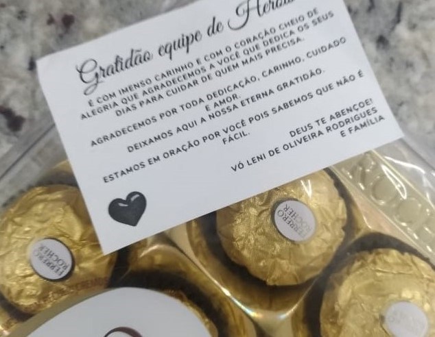 Foi com esse belo texto, fixado a uma caixa de bombons, que o dia da assistente social do Hospital Dr. Jayme Santos Neves, na Serra, Rosane Alves da Silva, se transformou e se encheu de emoção. Ela ganhou o presente da Mariany Barbosa Rodrigues Balbino, de 28 anos, que acompanhou a avó Leni de Oliveira Rodrigues, de 81 anos, enquanto esteve internada na unidade. Esta foi a forma que paciente e neta encontraram para retribuir todo o carinho, atenção e cuidado recebidos da profissional.