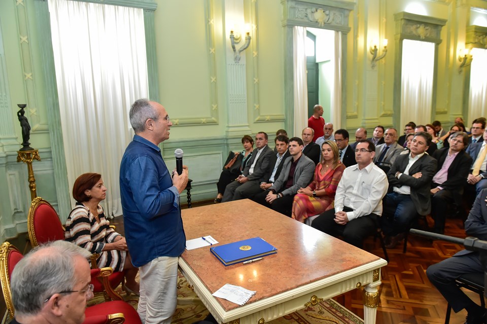 Na manhã desta segunda-feira (10), o governador Paulo Hartung reuniu membros do secretariado, diretores de órgãos e empresas públicas estaduais para discutir as diretrizes do Planejamento Estratégico 2017. Na oportunidade também foi realizado um breve ato solene onde Hartung reassumiu o comando do Poder Executivo Estadual. A reunião de trabalho foi realizada no Salão Nobre, no Palácio Anchieta, em Vitória.