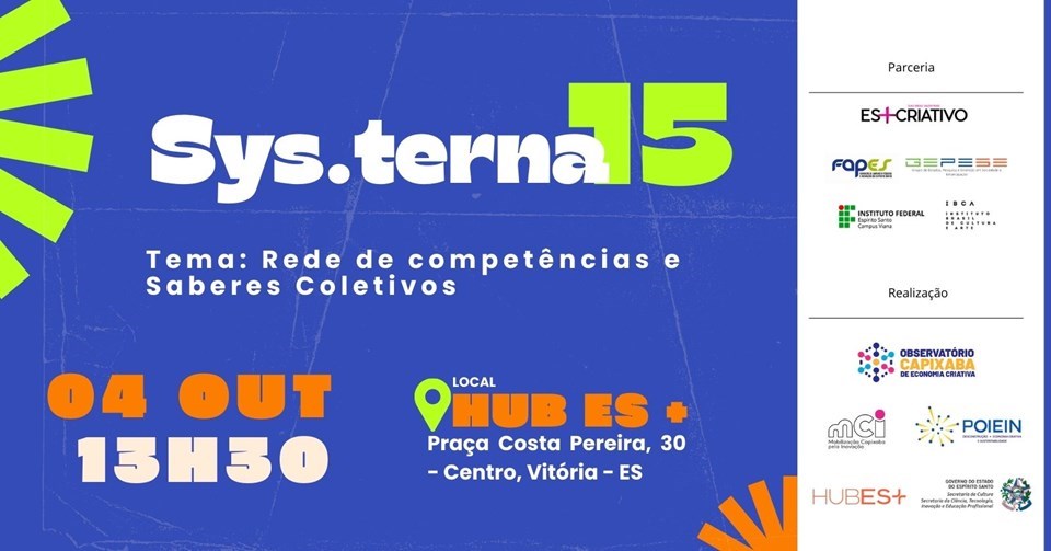 O HUB ES+, no Centro de Vitória, recebe no próximo sábado (04), coletivos de todo Espírito Santo para o 15° Seminário Sys.terna, com o tema Rede de Competências e Saberes Compartilhados (RCSC). Nesta edição, o seminário terá como objetivo ouvir os coletivos culturais e socioambientais para orientar as próximas ações do LabConecta/RCSC, além de apresentar o Observatório Capixaba de Economia Criativa e suas iniciativas, incluindo o lançamento do Boletim da Economia Criativa.