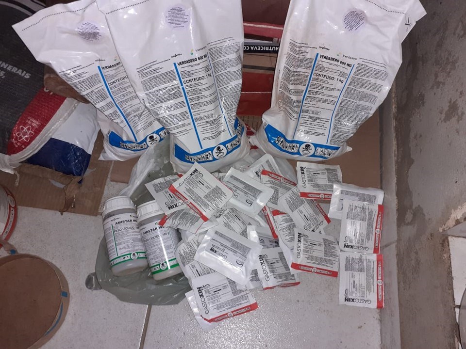 Foram apreendidos no estabelecimento e na casa do proprietário, aproximadamente, 200 quilos de agrotóxicos. O estabelecimento não possui registro no Idaf, o que é obrigatório para a comercialização dos produtos. Também foram encontrados agrotóxicos vencidos e armazenados de forma irregular.