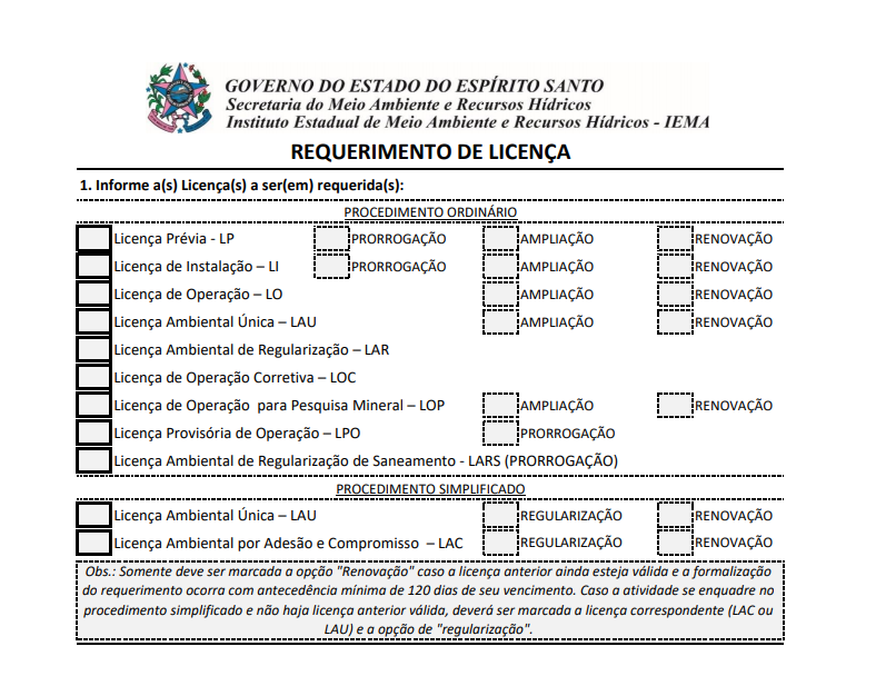 O Instituto Estadual de Meio Ambiente e Recursos Hídricos (Iema) adotará, a partir da próxima segunda-feira (1º), um novo formulário de requerimento de licença ambiental. O empreendedor que for requerer uma licença, deve ficar atento, pois o antigo modelo não será aceito. A mudança vale para todos os tipos de licenciamento, incluindo aqueles realizados por procedimento simplificado.