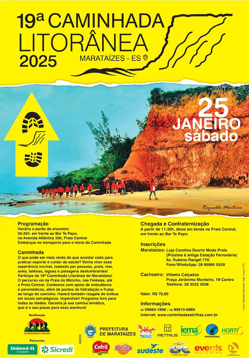 Com percurso da caminhada de 15 quilômetros, passando por praias e falésias, a 19ª Caminhada Litorânea de Marataízes está com inscrições abertas, que podem ser feitas pela internet, ou presencialmente em locais de inscrição em Marataízes e Cachoeiro de Itapemirim. O evento acontecerá no próximo sábado (25) e conta com o apoio do Instituto de Meio Ambiente e Recursos Hídricos (Iema).