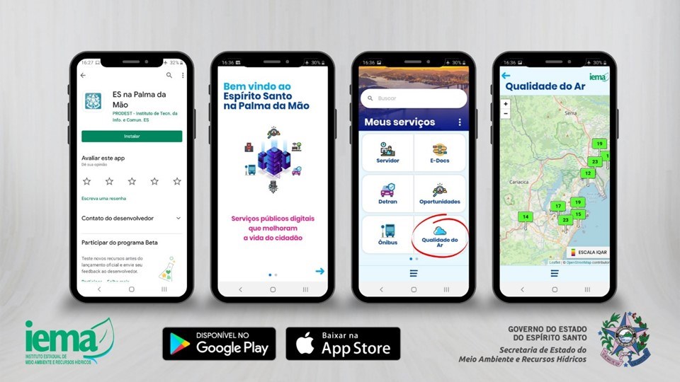 O Instituto Estadual de Meio Ambiente e Recursos Hídricos (Iema) acaba de disponibilizar um aplicativo, disponível gratuitamente nas plataformas Android e iOS, para informações, em tempo real, sobre a qualidade do ar da Grande Vitória. O aplicativo está hospedado na plataforma “ES na Palma da Mão”, programa do Governo do Estado do Espírito Santo que reúne iniciativas e serviços. É possível baixar o aplicativo nas lojas Play Store e APP Store