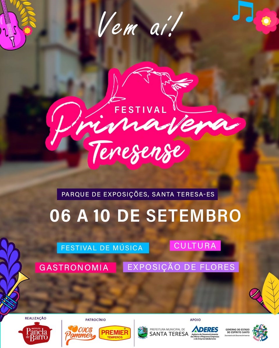 A primavera vem aí e, em Santa Teresa, a estação mais florida do ano chega regada de flores de diversas espécies e muita música. Isso porque, entre os dias 06 e 10 de setembro, a doce terra dos colibris recebe a terceira edição do Festival Primavera Teresense, que será realizado no Parque de Exposições da cidade, conectando o público com música de qualidade, saberes e sabores, e, claro, as flores. A entrada é gratuita.