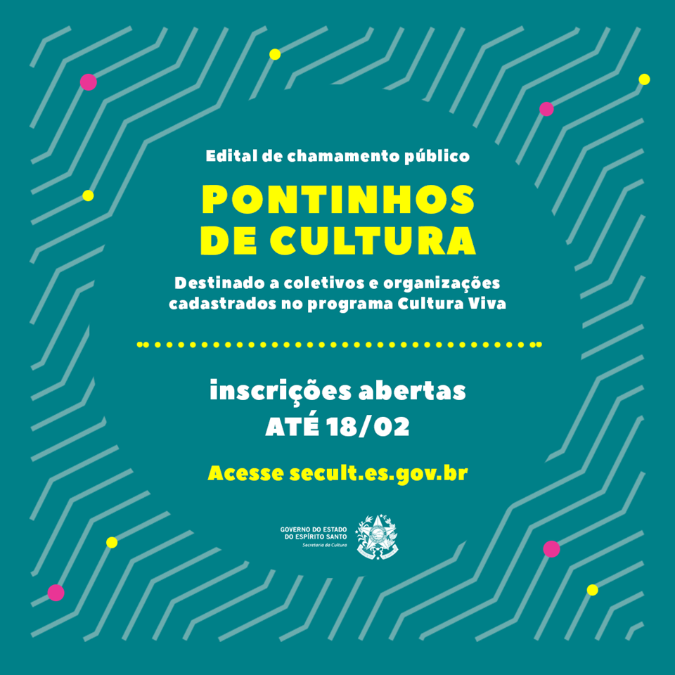 A Secretaria da Cultura (Secult) divulga a abertura das inscrições para o edital de chamamento público 001/2021 - Pontinhos de Cultura, que irá premiar 15 iniciativas culturais desenvolvidas por instituições privadas sem fins lucrativos, com constituição jurídica, e coletivos culturais sem constituição jurídica, cadastradas no Programa Cultura Viva, do Governo Federal. O Edital disponibiliza uma verba total de R$ 150 mil e ficará com inscrições abertas até o dia 18 de fevereiro.