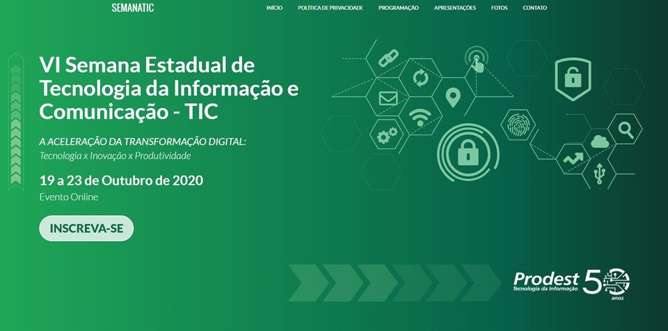 Os interessados já podem se inscrever pelo site https://semanatic.prodest.es.gov.br/, onde está disponível a programação. Todas as palestras serão on-line e realizadas no período de 19 a 23 de outubro. Neste ano, o evento tem como tema “A Aceleração da Transformação Digital: Tecnologia X Inovação X Produtividade.