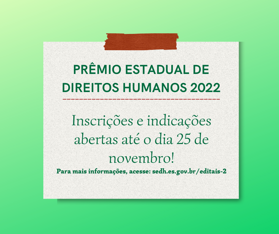 As pessoas, os movimentos sociais e as organizações não governamentais que se dedicam à proteção e defesa dos direitos humanos no Estado têm até o próximo dia 25 de novembro deste ano para se inscrever ou fazer as indicações para o Prêmio Estadual de Direitos Humanos 2022. A premiação, organizada pela Secretaria de Direitos Humanos (SEDH) e pelo Conselho Estadual de Direitos Humanos do Espírito Santo (CEDH-ES), vai ocorrer durante a XIV Semana Estadual de Direitos Humanos, que será realizada em dezembro deste ano.