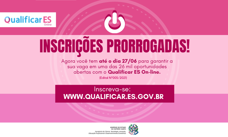 As inscrições para 26 mil oportunidades em cursos on-line gratuitos do programa Qualificar ES foram prorrogadas. Os interessados têm até este domingo (27) para garantirem a sua vaga. O programa é oferecido pelo Governo do Espírito Santo, por meio da Secretaria de Inovação e Desenvolvimento (Sectides).