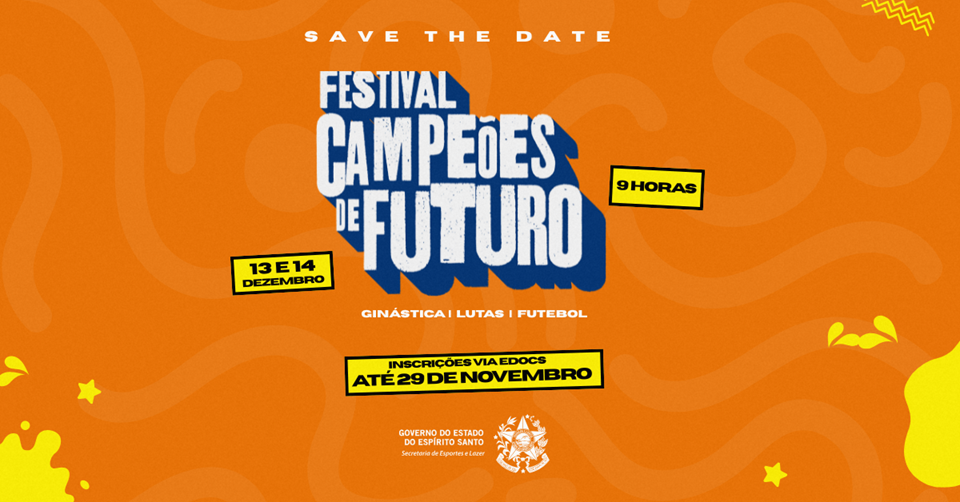 As inscrições para participar do Festival Campeões de Futuro seguem abertas até este sábado (29). Pelo segundo ano consecutivo, o evento será realizado com o objetivo de reunir jovens atletas do projeto Campeões de Futuro, da Secretaria de Esportes e Lazer (Sesport), em dois dias de atividades esportivas que vão envolver municípios de todas as regiões do Espírito Santo.