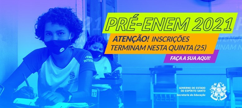 Os alunos que desejam participar do processo seletivo para o Pré-Enem Digital têm até esta quinta-feira (25) para fazer a inscrição por meio deste link: https://forms.gle/3hGprJwX9DRidRuc6. Podem se inscrever os estudantes da 3ª série do Ensino Médio, matriculados no Ensino Regular; no Integrado à Educação Profissional (EMI); nas 2ª e 3ª etapas da Educação de Jovens e Adultos (EJA); nos Centros e Núcleos Estaduais da Educação de Jovens e Adultos (CEEJA/NEEJA), no ano de 2021; e os concludentes da 3ª etapa da EJA do ano de 2020.