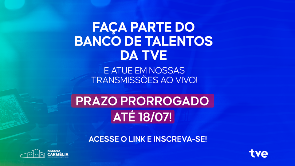 A TVE, por meio da Fundação Carmélia, vai convocar profissionais para trabalhar na transmissão ao vivo de eventos e o edital de inscrição foi prorrogado até esta sexta-feira (18). Há vagas para prestadores de serviços, como cinegrafistas, diretores de imagem, operadores de replay, operadores de caracteres, operadores de drone, de guimbal, técnico de vídeo e técnico de áudio.