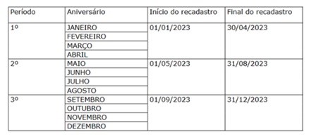 Os beneficiários precisam ficar atentos ao período em que deverão se recadastrar, conforme mostra tabela a seguir.