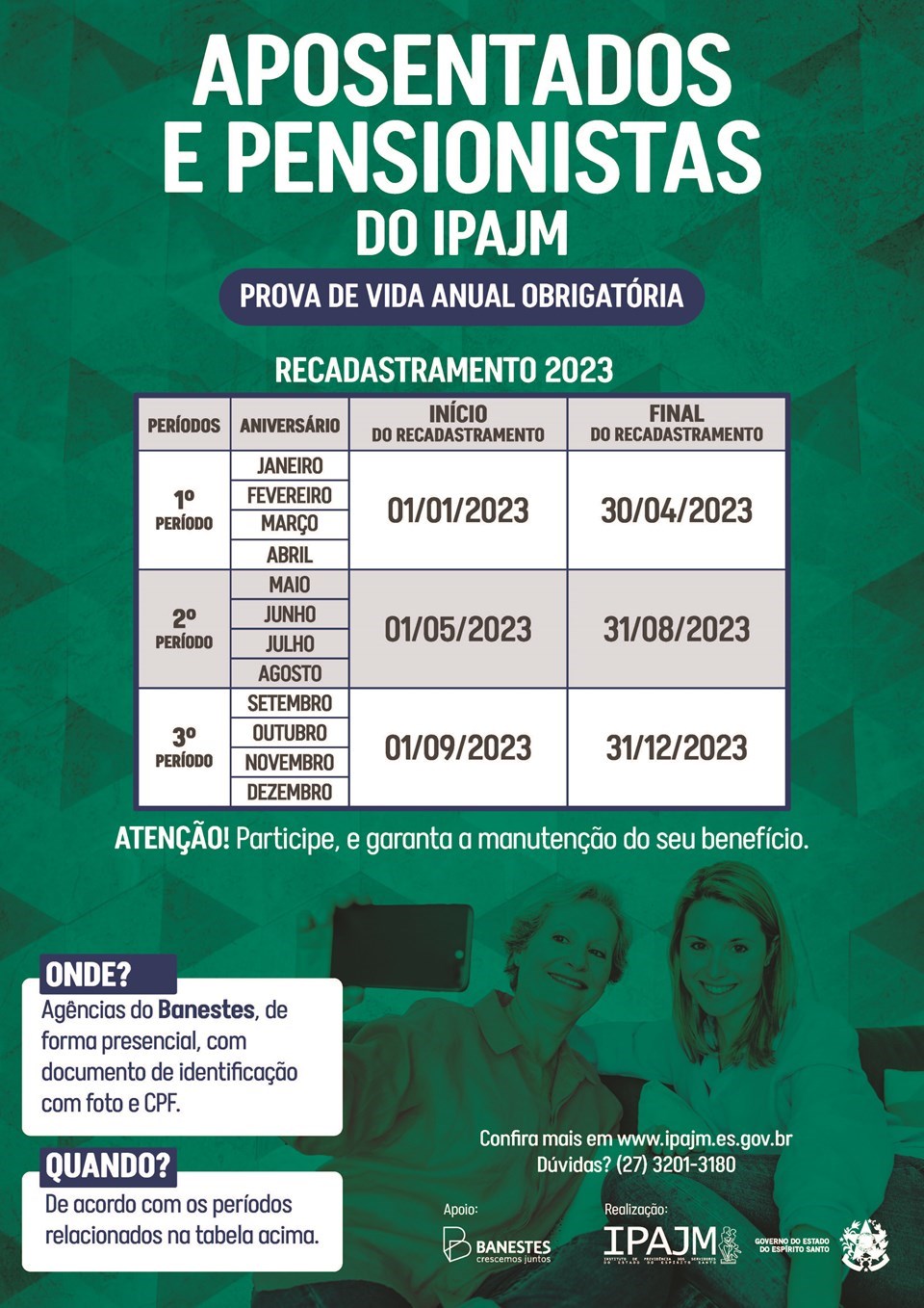 O Recadastramento, por meio de Prova de Vida, do ano de 2023, teve início em janeiro último, e os aposentados e pensionistas aniversariantes de janeiro a abril devem se recadastrar até o próximo dia 30 de abril, para garantir a manutenção do pagamento de seus benefícios. O procedimento é obrigatório, anual, e deve ser realizado de forma presencial em qualquer agência do Banco do Estado do Espírito Santo (Banestes), com documento de identificação com foto e CPF.