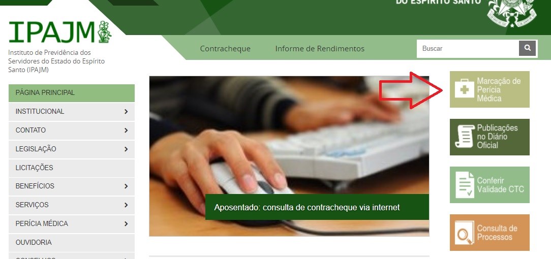Para proceder com o agendamento de perícia, tanto em relação a comum quanto à admissional, via on-line, é necessário que a pessoa entre no sítio www.ipajm.es.gov.br, e clique no banner “Marcação de Perícia Médica”, localizado à direita, conforme mostra imagem abaixo.
