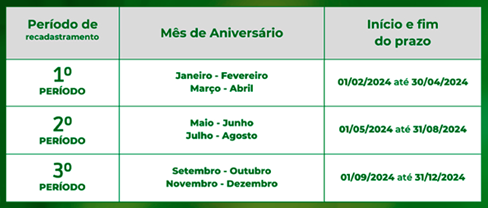 O Recadastramento de 2024 do IPAJM foi dividido em três períodos, de acordo com a tabela abaixo, e os beneficiários devem se recadastrar no mês de seu aniversário.
