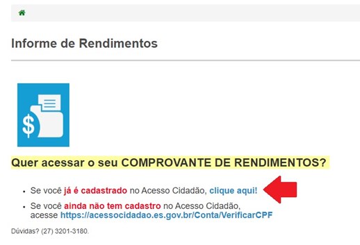 3. Se você não tiver cadastro no Acesso Cidadão, entre em https://acessocidadao.es.gov.br/Conta/VerificarCPF para efetuar o referido cadastro. Após esse procedimento será possível acessar a sua declaração de rendimentos.