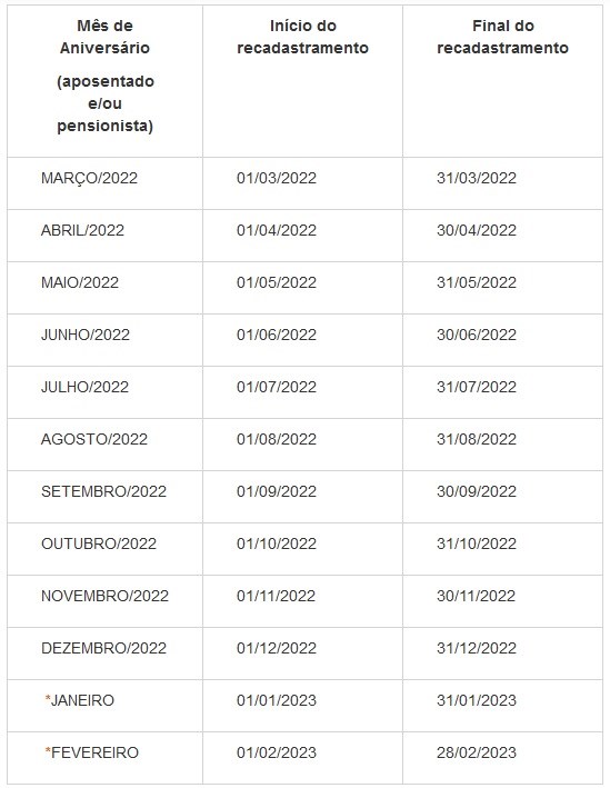 Todos os detalhes referentes a essa ação estão disponíveis na Portaria nº 03-R, publicada no Diário Oficial de 09/02/2022. Segue tabela explicativa sobre quando os segurados devem se recadastrar: