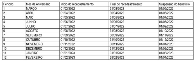 Veja a seguir a tabela com o período em que os segurados devem se recadastrar.