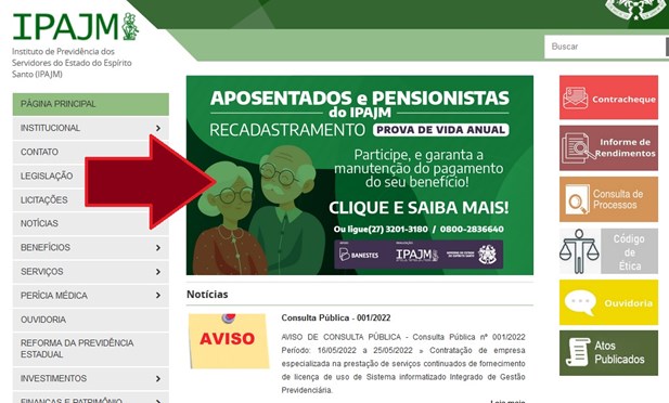 As informações referentes ao Recadastramento do IPAJM constam no site www.ipajm.es.gov.br dentro do banner que trata dessa ação, na parte principal da página, de acordo com imagem abaixo.