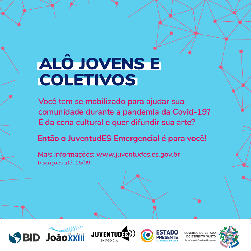 As juventudes capixabas que estão atuando em suas comunidades e nas redes sociais durante a pandemia do novo Coronavírus (Covid-19) já podem se inscrever no Edital JuventudES Emergencial, lançado pelo Instituto João XXIII, em parceria com a Secretaria de Direitos Humanos (SEDH), a partir desta terça-feira (01). Serão contemplados até 100 projetos em dois eixos, organizados tanto por jovens quanto por coletivos. As inscrições seguem abertas até o dia 15 de setembro, pelo site: www.juventudes.es.gov.br.