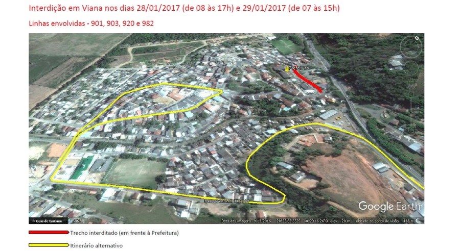 Nestes sábado (28) e domingo (29), quatro linhas do Sistema Transcol que atendem ao município de Viana terão alteração de itinerário em função da realização do evento “Viana Adventure”. A Avenida Florentino Avidos, em frente à Prefeitura de Viana, será interditada durante o dia. As linhas 901, 903, 920 e 982 vão deixar de passar neste trecho, nos dois sentidos, no sábado (28), das 8h às 17h, e no domingo (29), das 7h às 15h.