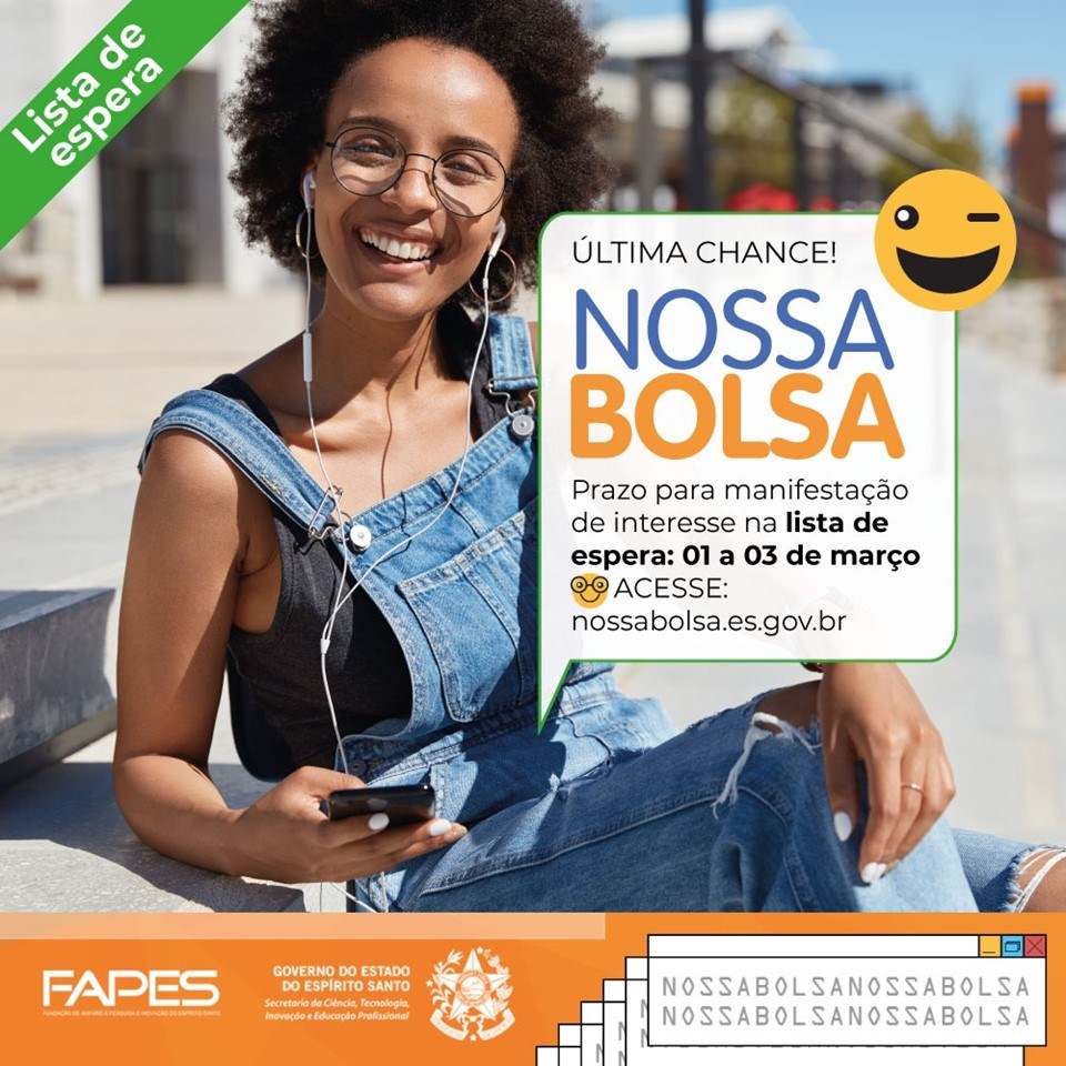 Os candidatos que foram desclassificados por questões de nota, ou por não atenderem a outros critérios do programa, não podem concorrer às vagas ofertadas nesta etapa. Para manifestar o interesse, basta acessar o site do Nossa Bolsa (www.nossabolsa.es.gov.br), fazer o login com suas informações pessoais e escolher a opção para participar da lista de espera. A opção aparece somente para os candidatos inscritos em cursos que estão com vagas disponíveis.