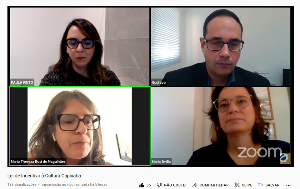 A live contou com a presença das representantes da Secretaria da Cultura (Secult), Maria Thereza Bosi de Magalhães, subsecretária de Fomento e Incentivo à Cultura; e Maria Emilia Vasconcellos, gerente de Incentivo à Cultura; e do representante da Secretaria da Fazenda (Sefaz), Gustavo Juliano Leitão da Cruz, auditor Fiscal da Receita Estadual. A mediação ficou por conta da vice-presidente de Desenvolvimento Profissional do Conselho Regional de Contabilidade do Espírito Santo (CRC/ES), Paula Antonela.