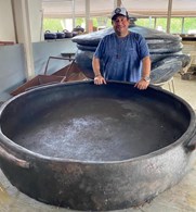 Secretário de Turismo de Conceição da Barra Roberto Malacarne com a panela onde será preparada a moqueca.