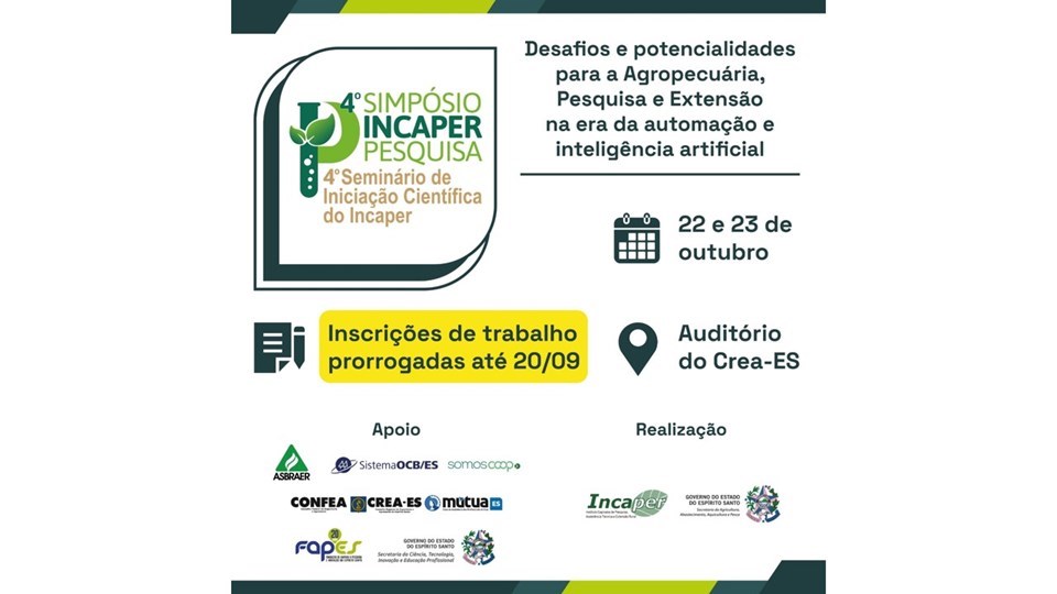 Ainda é possível inscrever trabalhos na quarta edição do Simpósio Incaper Pesquisa e do Seminário de Iniciação Científica. O Instituto Capixaba de Pesquisa, Assistência Técnica e Extensão Rural (Incaper) prorrogou o prazo para submissão de resumos até o dia 20 de setembro.