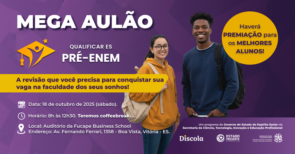 Com a proximidade do Exame Nacional do Ensino Médio (Enem), o Governo do Estado do Espírito Santo, por meio do programa Qualificar ES Pré-Enem e da Secretaria da Ciência, Tecnologia, Inovação e Educação Profissional (Secti), realizará o "Mega Aulão Pré-Enem". O evento, presencial e totalmente gratuito, acontecerá no dia 18 de outubro, das 8h às 12h30, no auditório da Fucape Business School, em Vitória, e tem como objetivo oferecer uma revisão estratégica para os estudantes na reta final de preparação.