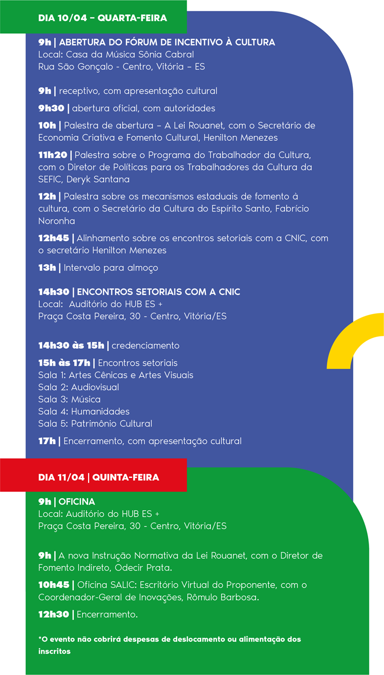 No primeiro dia, haverá palestras sobre o mecanismo do incentivo fiscal do Programa Nacional de Apoio à Cultura (Pronac) via Lei Rouanet, com o secretário de Economia Criativa e Fomento Cultural (Sefic) do MinC, Henilton Menezes; o Programa do Trabalhador da Cultura, com o diretor de Políticas para os Trabalhadores da Cultura da SEFIC, Deryk Santana; e os mecanismos estaduais de fomento à cultura, com o secretário de Estado da Cultura do Espírito Santo, Fabrício Noronha, que também integra a CNIC.