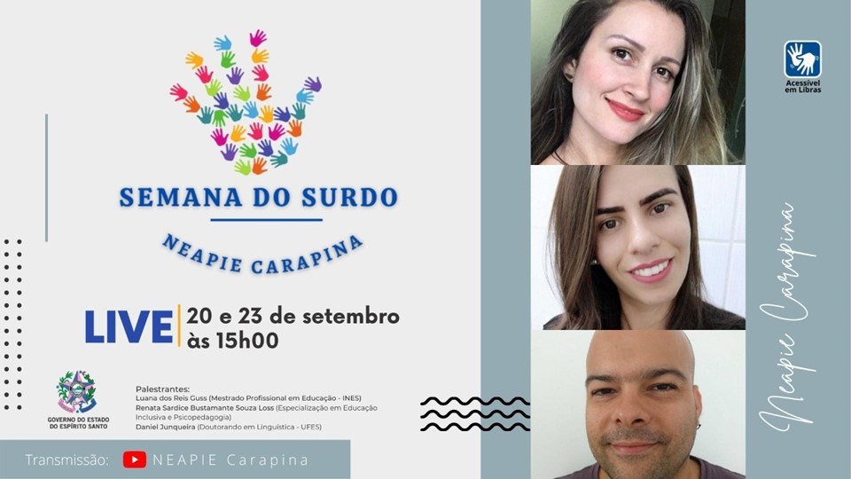 O Núcleo Estadual de Apoio Pedagógico à Inclusão Escolar (NEAPIE) da Superintendência Regional de Educação (SRE) de Carapina, transmitirá lives, na próxima segunda-feira (20) e quinta-feira (23), no canal do Núcleo no YouTube: https://www.youtube.com/c/NEAPIECarapina/featured.