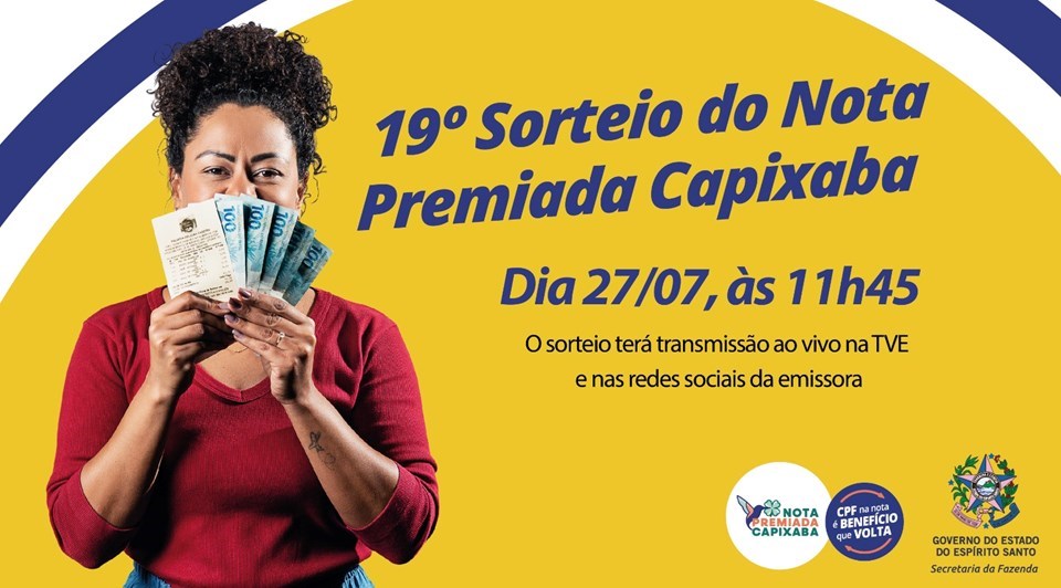 Está chegando a hora de conhecer os ganhadores do mês de julho do programa Nota Premiada Capixaba. O 19º sorteio acontece nesta quinta-feira (27), com a distribuição de 12 prêmios com valores entre R$ 2,5 mil e R$ 20 mil. O sorteio será transmitido ao vivo, às 11h45, pela TVE Espírito Santo e pelas redes sociais da emissora.