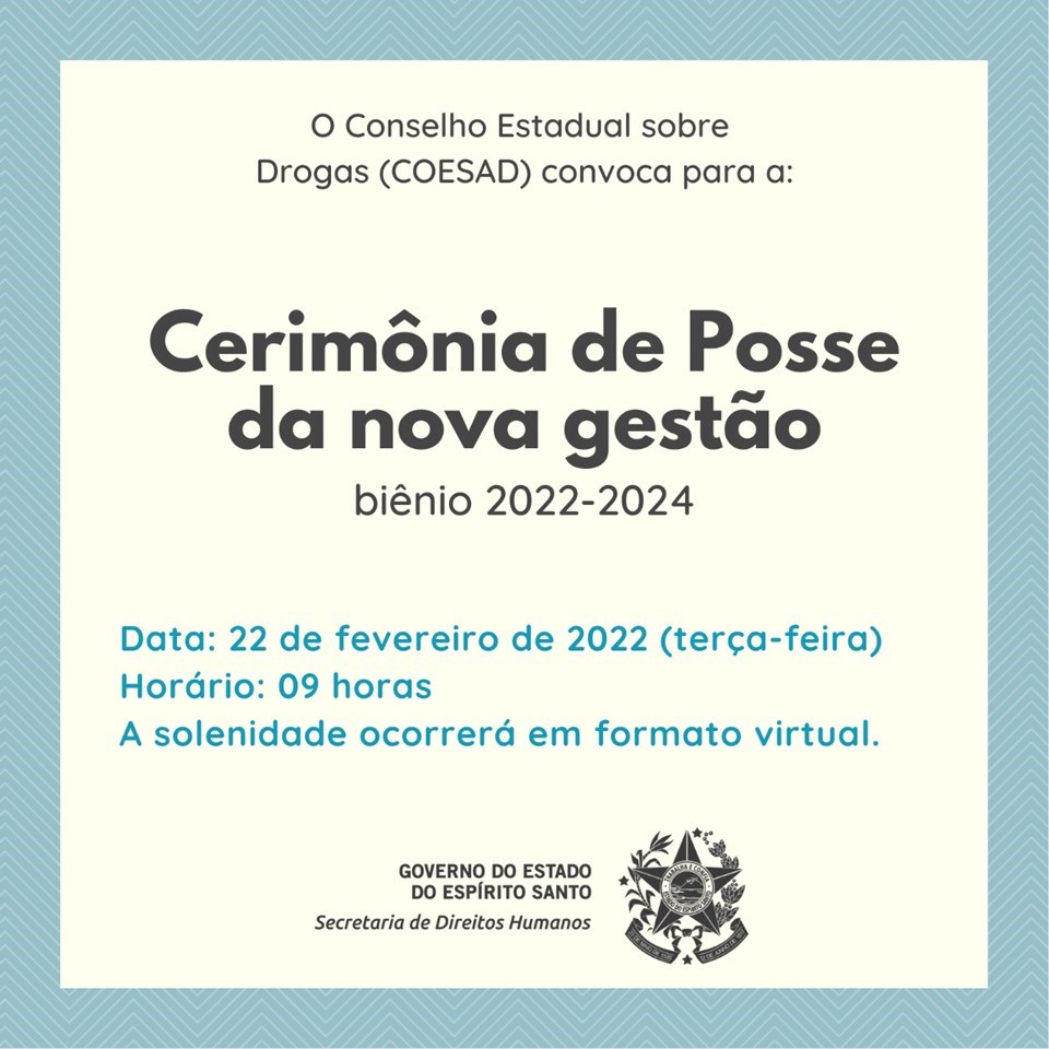 Membros da nova gestão do Conselho Estadual sobre Drogas (Coesad), biênio 2022-2024, vão tomar posse na próxima terça-feira (22). A solenidade vai ocorrer em formato virtual, às 9 horas.