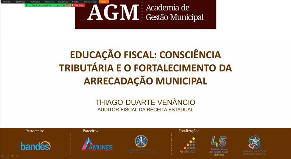 O Núcleo de Educação Fiscal (NEF) da Secretaria da Fazenda (Sefaz) ministrou a disciplina Educação Fiscal – Consciência Tributária e Fortalecimento da Arrecadação Municipal na Academia de Gestão Municipal do Estado. A primeira aula aconteceu, nesta terça-feira (03), e a próxima será na quinta-feira (15), das 09h às 12h.