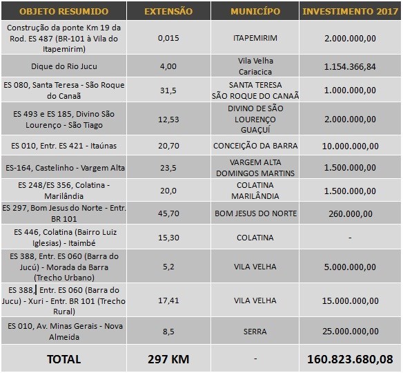 ”São obras estruturantes que vão contribuir para o escoamento da produção agrícola, a melhoria da competitividade da produção nas regiões onde serão realizadas e que contemplam um importante benefício social, uma vez que as vias pavimentadas e sinalizadas ajudam na locomoção e na aproximação das pessoas. É mais qualidade de vida e mais desenvolvimento", destaca o diretor-geral do DER-ES, Enio Bergoli.