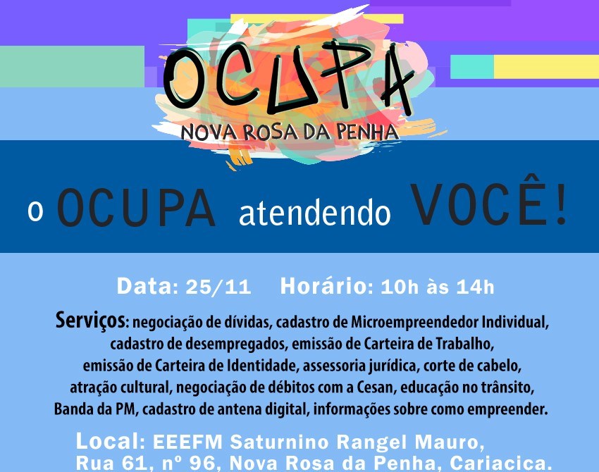 Mais um bairro será atendido pelo Projeto Ocupa, da Secretaria de Estado de Direitos Humanos (SEDH). A comunidade de Nova Rosa da Penha, em Cariacica, receberá o Ocupa Nova Rosa da Penha neste sábado (25), trazendo atendimento personalizado e ações de promoção à cidadania. O evento vai acontecer das 10h às 14h, na EEEFM Saturnino Rangel Mauro, na Rua 61, nº 96.