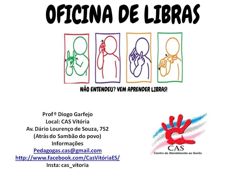 A partir da próxima segunda-feira (02) o Centro de Capacitação de Profissionais da Educação e de Atendimento às Pessoas com Surdez (CAS) de Vitória realizará ‘Oficinas de Libras’, aberta a toda comunidade. Para participar, basta comparecer no local e horário, conforme o tema desejado. As oficinas serão ministradas na Avenida Dário Lourenço de Souza, 752, Centro, Vitória. Clique aqui para ver o cronograma!