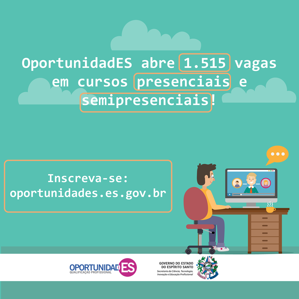 O projeto OportunidadES está com 1515 vagas abertas para cursos presenciais e semipresenciais. As chances são para os moradores de São Marcos e Feu Rosa, na Serra, e para todos os moradores de Viana, com cursos de qualificação profissional presenciais de 40 horas. Já os cursos de 180 horas semipresenciais são destinados aos profissionais da área da educação.
