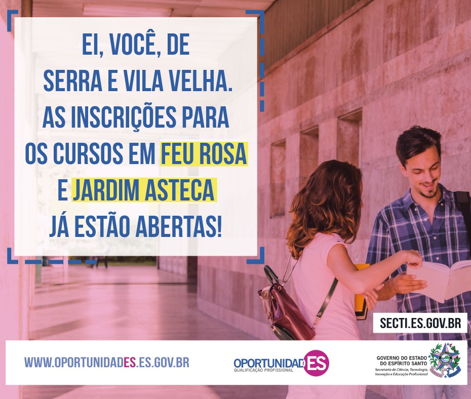São 14 opções de cursos e nove deles estarão disponíveis em Feu Rosa e dez em Jardim Asteca. Para se inscrever basta acessar o site do projeto www.oportunidades.es.gov.br. As inscrições terminam no próximo domingo (03). No site o candidato também encontra o edital com todas as informações necessárias sobre vagas, listas dos aprovados, início das aulas e formaturas.