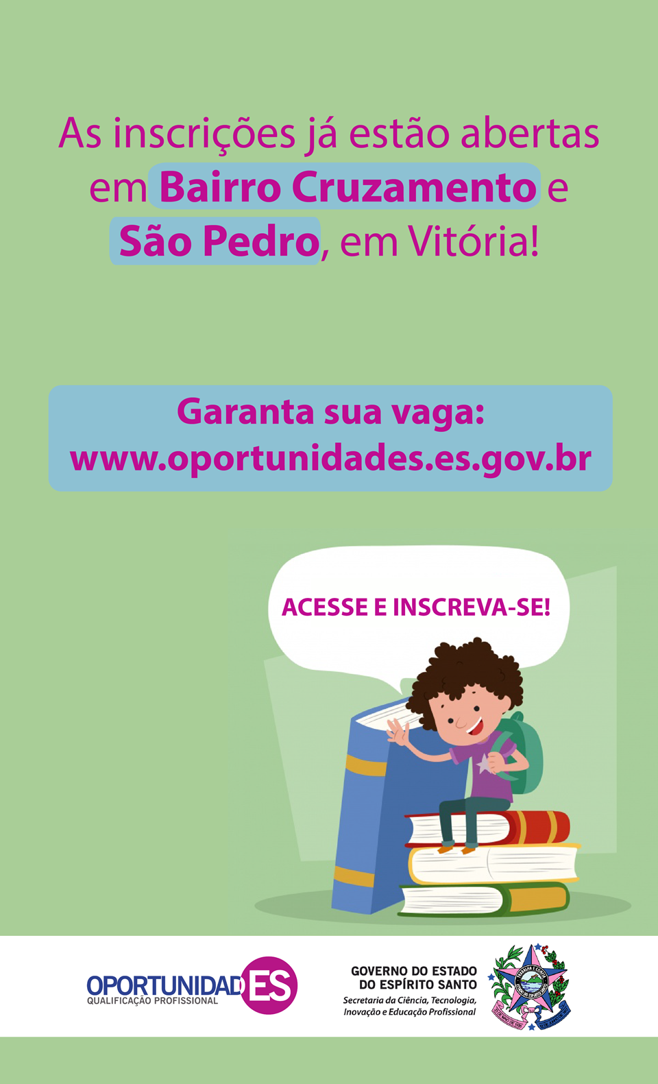 Para se inscrever o candidato deve acessar o site do projeto (www.oportunidades.es.gov.br) e preencher corretamente a ficha de inscrição. As inscrições, para os dois bairros, começaram nesta terça-feira (30) e terminam no próximo domingo (04).