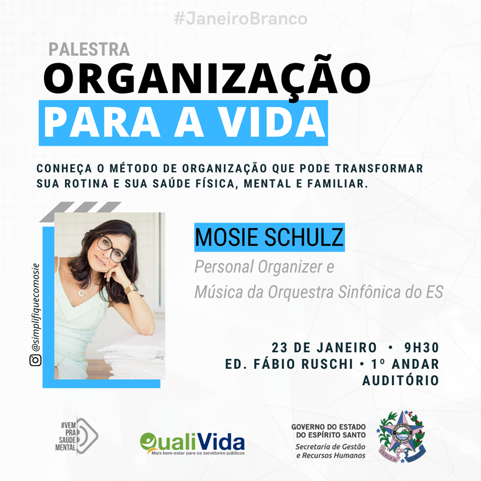 Nesta quinta-feira (23), às 9h30, será realizada no auditório do Edifício Fábio Ruschi, no Centro de Vitória, a palestra “Organização para a vida”, com a personal organizer e musicista da Orquestra Sinfônica do Espírito Santo (Oses), Mosie Schulz. Para participar, basta se inscrever pelo link: http://bit.ly/palestraorganizacaoparavida.