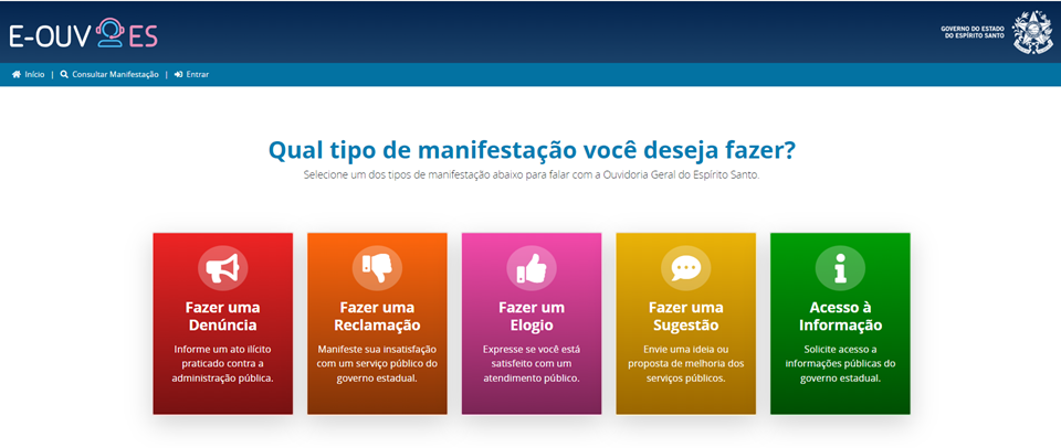 Fazer uma reclamação, denúncia, sugestão, elogio ou pedido de informação ao Governo do Estado ficou mais fácil e rápido: a Ouvidoria-Geral, em parceria com o Instituto de Tecnologia da Informação e Comunicação do Estado (Prodest), desenvolveu uma plataforma mais moderna e amigável para que o cidadão registre sua manifestação por meio da internet e receba a resposta.