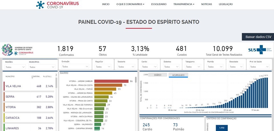 Lançado em 15 de abril pelo Governo do Estado, o “Painel Covid-19” é um sistema público para consulta dos dados do novo Coronavírus no Espírito Santo, que disponibiliza as informações sobre a situação da doença no Estado, de forma transparente e diária.