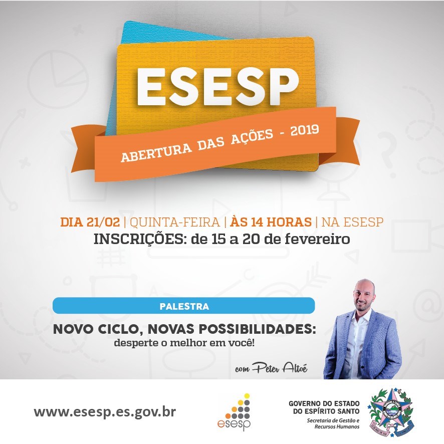 Com o objetivo de marcar oficialmente o início das atividades de capacitação dos servidores neste ano, a Escola de Serviço Público do Espírito Santo (Esesp) promoverá um evento de abertura das ações programadas para 2019. O encontro será realizado na próxima quinta-feira (21), a partir das 14 horas. A participação é aberta aos profissionais do Estado e dos municípios.
