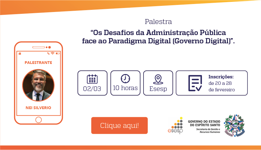 A Escola de Serviço Público do Espírito Santo (Esesp), em parceria com a Secretaria de Governo (SEG), promoverá, no dia 02 de março, a palestra “Os Desafios da Administração Pública face ao Paradigma Digital (Governo Digital)”. O evento é aberto à participação de servidores públicos estaduais e municipais. As inscrições começam nesta quinta-feira (20).