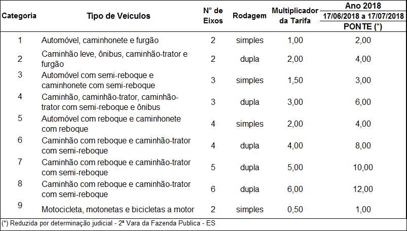 Para preservar o equilíbrio do contrato, as tarifas no sentido norte (Vila Velha – Vitória) passam a valer conforme o quadro a seguir. A ARSP esclarece também que permanecem sendo respeitadas as decisões judiciais que pairam sobre o Contrato de Concessão nº 01/1998, em que as tarifas da Terceira Ponte foram recalculadas de forma a contemplar exclusivamente o valor correspondente à manutenção e conserva especial do Sistema Rodovia do Sol, retirando os investimentos em obras, serviços e outros.