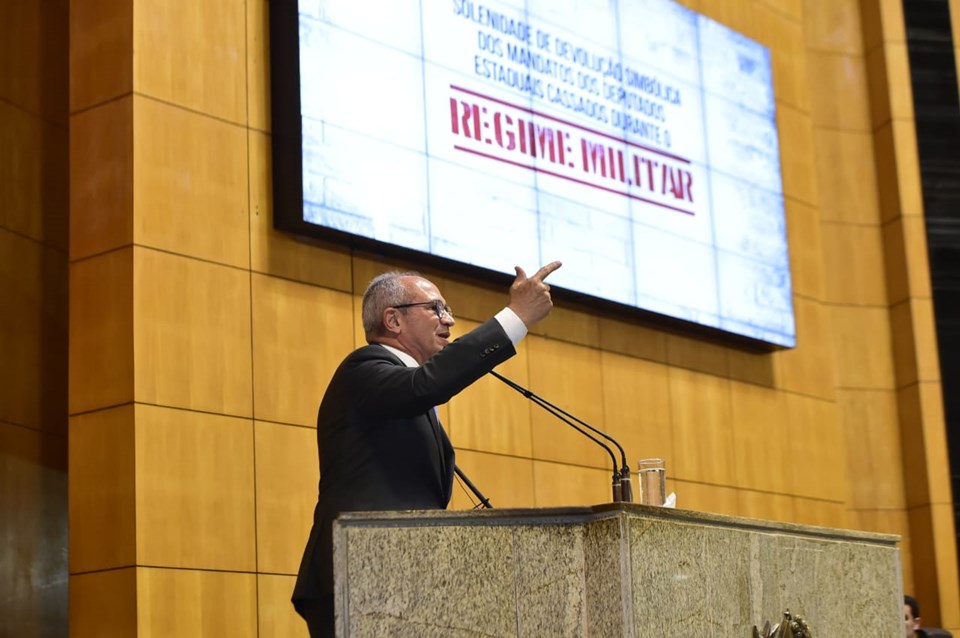 Na sessão ordinária desta terça-feira (12), durante o Pequeno Expediente, a Assembleia Legislativa realizou a devolução simbólica dos mandatos de quatro deputados estaduais cassados durante regimes de exceção: Benjamim de Carvalho Campos (1948), Helsio Pinheiro Cordeiro (1966), José Ignácio Ferreira e Dailson Laranja (cassados em março de 1969).