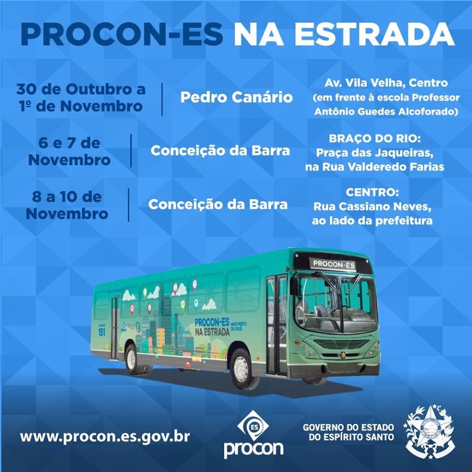 O Procon-ES na Estrada – unidade móvel de atendimento – está atendendo na Região Nordeste do Estado. Nestas segunda (30), terça (31) e quarta-feira (1º), o ônibus estará em Pedro Canário. De lá, pegará a estrada para Conceição da Barra, onde realizará atendimento aos consumidores na segunda (06) e na terça-feira (07), em Braço do Rio, e na quarta (06), na quinta (07) e na sexta-feira (08), no Centro. A equipe orientará a população sobre os cuidados na compra de produtos, contratação de serviços, além de registrar reclamações e negociar dívidas.