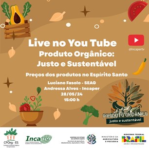O Incaper transmite, nesta terça-feira (28), às 15h, a Live: Produto Orgânico: justo e sustentável - preços dos produtos no Espírito Santo. Onde o tema será amplamente discutido, pelo autor, o coordenador de Agroecologia da Seag, Luciano Fasolo, e Andressa Alves, coordenadora de Agroecologia do Incaper.
